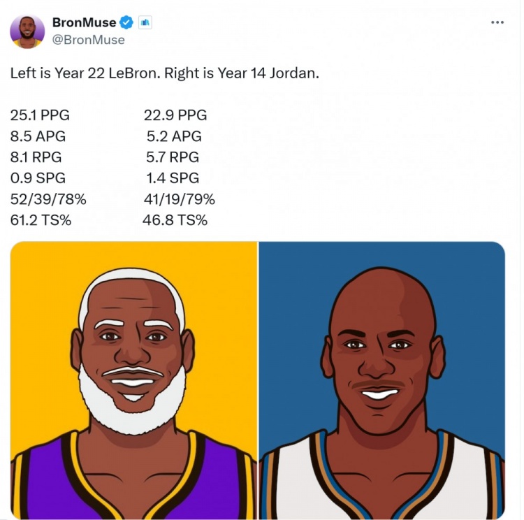 美媒:第22季詹姆斯25+8+8&三分39% 第14季喬丹23+5+5&19%