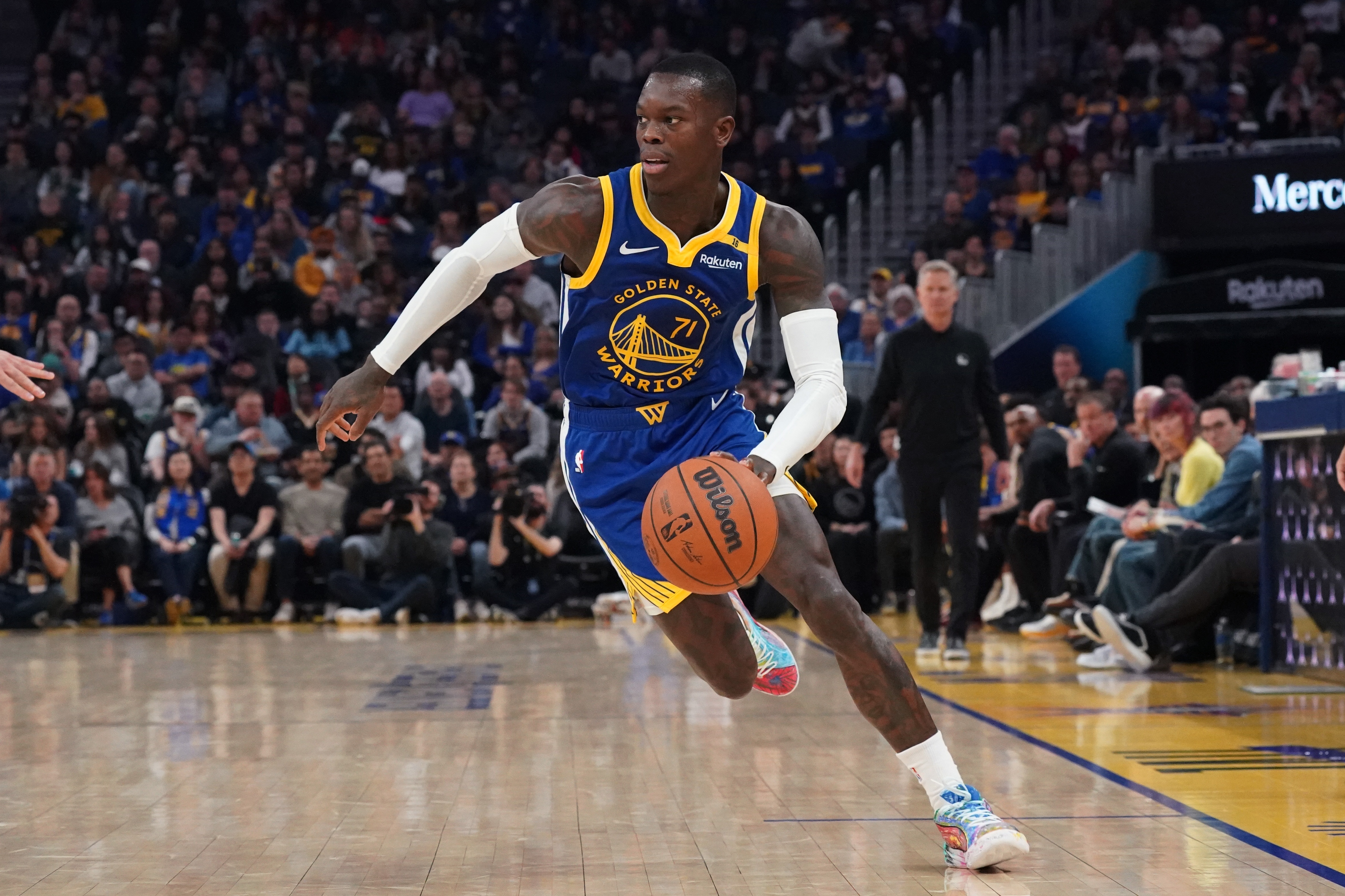 這就是勇士隊(duì)在12月中旬交易來丹尼斯-施羅德的初衷:試圖為已經(jīng)淪為聯(lián)盟倒數(shù)三分之一的進(jìn)攻注入新的活力,并在一系列嘗試中做出新的努力,以止住在庫里離場時(shí)的失血。但是,盡管勇士隊(duì)在交易后堅(jiān)稱一名高位擋拆組織者將是對(duì)球隊(duì)的有益補(bǔ)充(在主教練史蒂夫-科爾的帶領(lǐng)下,球隊(duì)有時(shí)會(huì)固執(zhí)地避免過度依賴籃球中最流行的戰(zhàn)術(shù)),但施羅德并沒有融入球隊(duì),他場均可以得到10.6分,三項(xiàng)投籃命中率分別為38%、32%和74%。根據(jù)Cleaning the Glass的數(shù)據(jù),當(dāng)施羅德在場上時(shí),勇士隊(duì)在每100個(gè)非垃圾時(shí)間的進(jìn)攻回合中凈負(fù)9.9分,當(dāng)他在庫里休息時(shí)主導(dǎo)進(jìn)攻時(shí),球隊(duì)的得分水平仍然處于墊底。
