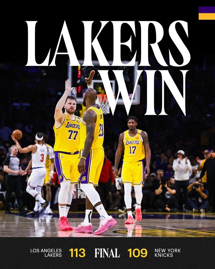 賽后湖人官方曬出本場贏球海報,詹姆斯、東契奇和芬尼-史密斯登上封面。