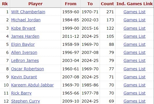 據(jù)統(tǒng)計(jì),這是庫里生涯第70場比賽40+,追平賈巴爾和里克巴里,并列歷史第10。