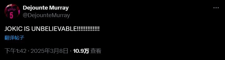 賽后,鵜鶘后衛(wèi)德章泰-穆雷更推寫道:約基奇實(shí)在太不可思議了!