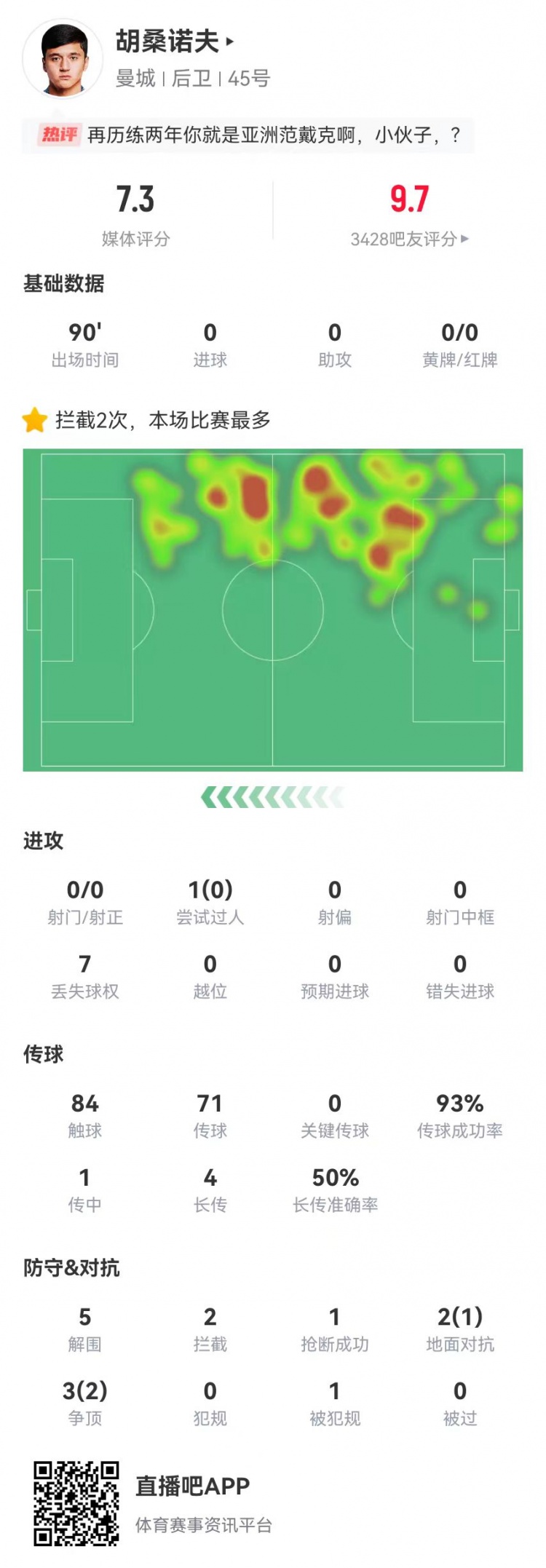 贊不絕口!胡桑諾夫本場(chǎng)5解圍2封堵2攔截1搶斷0被過(guò) 獲評(píng)7.3分
