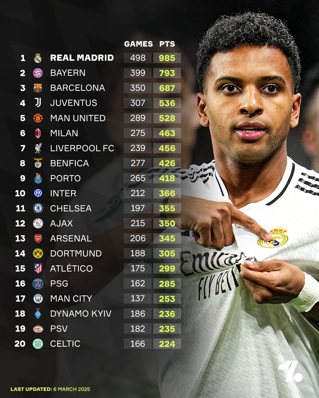 03月08日訊 在OneFootball公布的歐冠歷史積分榜上,皇馬以498場比賽積985分的成績高居榜首,拜仁399場積793分排在第二位,巴薩350場比賽687分位列第三。