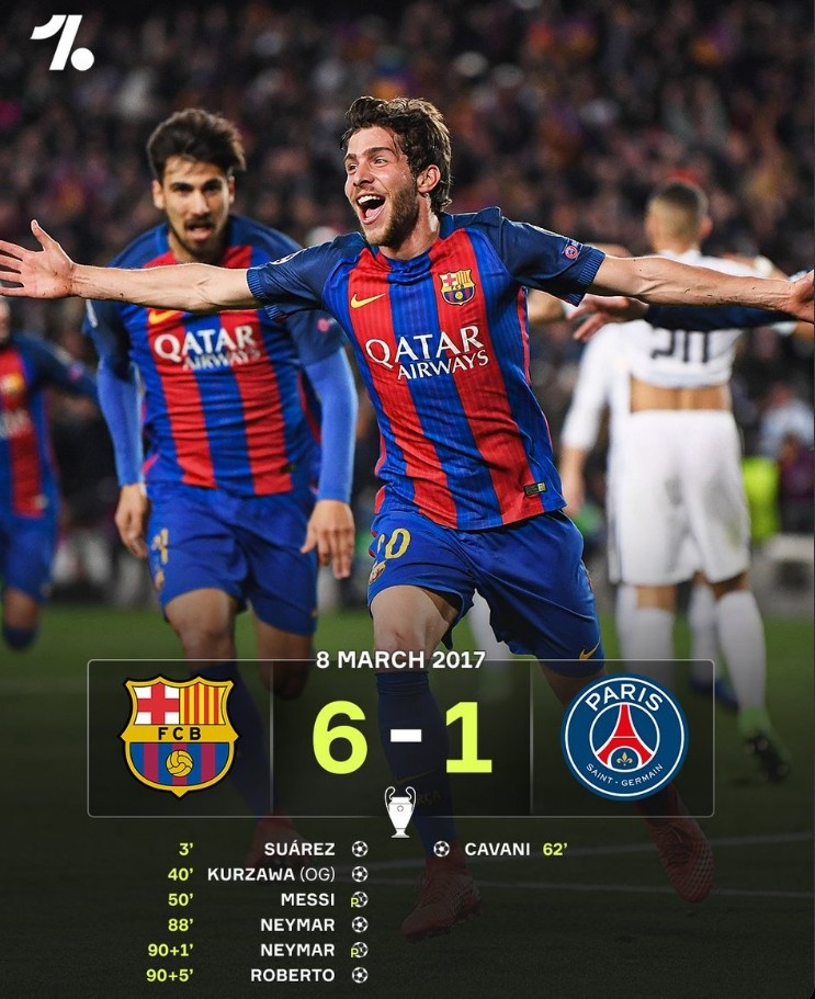 3月8日訊 在2017年的今天,巴薩在歐冠淘汰賽次回合以6-1大勝巴黎,成為歐冠歷史首支首回合0-4落后最終逆轉(zhuǎn)晉級(jí)的球隊(duì)。