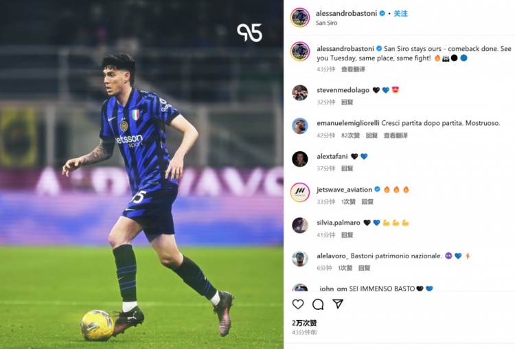 數(shù)據(jù)統(tǒng)計顯示,巴斯托尼本場貢獻(xiàn)4關(guān)鍵傳球+2射門,此外6次對抗有5次成功。他也在賽后通過社媒曬出自己的比賽照,并配文:“圣西羅仍然是我們的,逆轉(zhuǎn)成功。同一塊場地,同等的努力奮戰(zhàn),球迷們周二再見!”