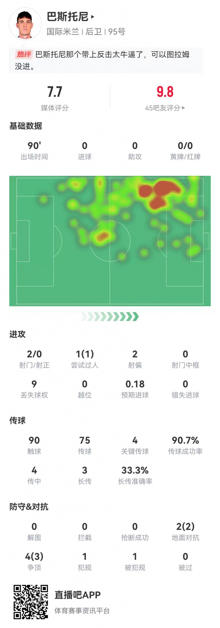 巴斯托尼客串左翼衛(wèi)數(shù)據(jù):4關(guān)鍵傳球+2射門 6對抗5成功 獲評7.7分