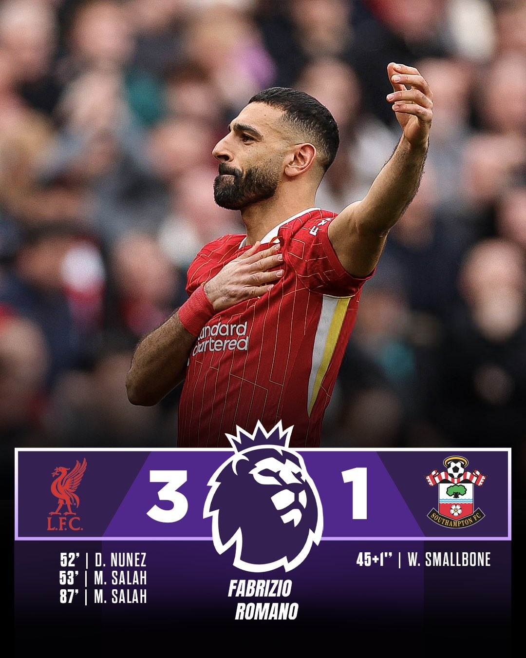 薩拉赫聯(lián)賽對(duì)陣南安普頓打進(jìn)10球,追平伊恩-拉什保持的進(jìn)球紀(jì)錄