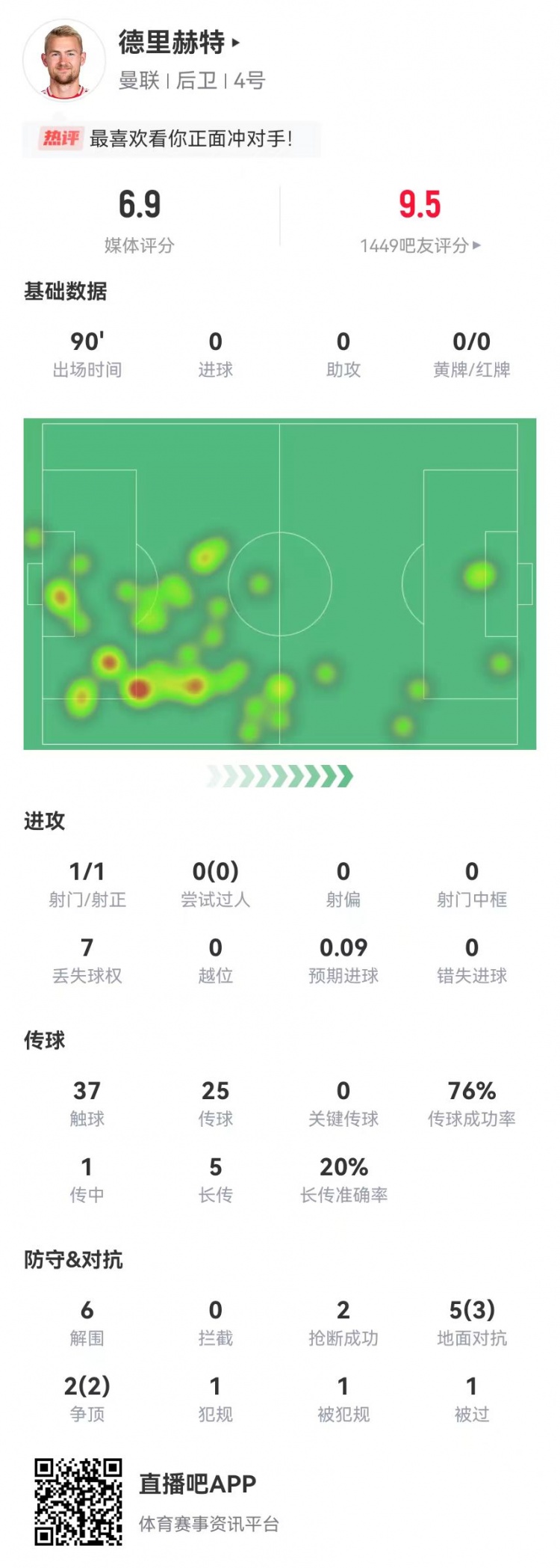 定海神針!德里赫特本場(chǎng)6解圍2搶斷 7對(duì)抗5成功 獲評(píng)6.9分