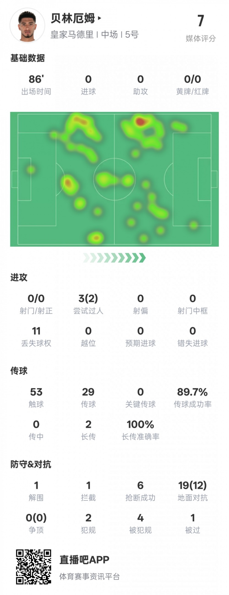 貝林厄姆本場數(shù)據(jù):12次地面對抗成功2過人成功6搶斷,評分7.0