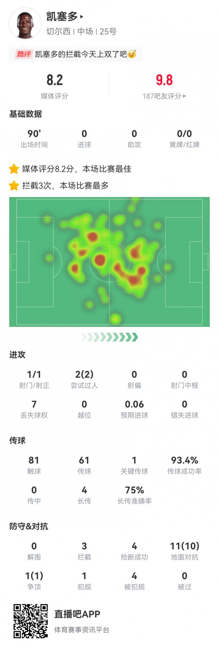 凱塞多本場12對(duì)抗11成功+4造犯規(guī) 3攔截4搶斷0被過 獲評(píng)8.2分最高