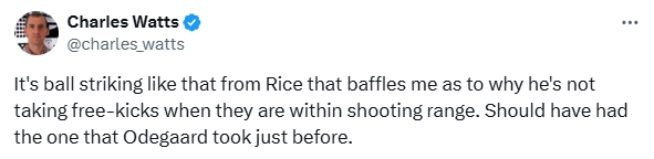 在賴斯進(jìn)球后,阿森納系的記者Charles Watts在社媒表示:“賴斯這樣的射門讓我困惑了,為什么獲得射程范圍以內(nèi)的任意球時(shí)不讓他去主罰呢?之前厄德高主罰的那個(gè)任意球應(yīng)該讓他去踢?!?/p>