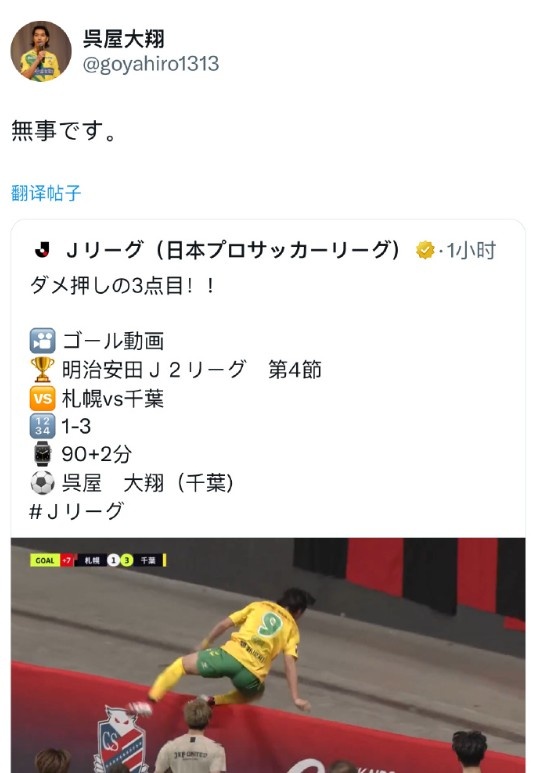 札幌主場(chǎng)為札幌穹頂體育場(chǎng),與普通球場(chǎng)不同,球門后面的廣告牌距離地面有2.8米高,吳屋大翔就從高處掉到了水泥地面上,當(dāng)時(shí)取得進(jìn)球的他想要翻越廣告牌和球迷們一起慶祝。
