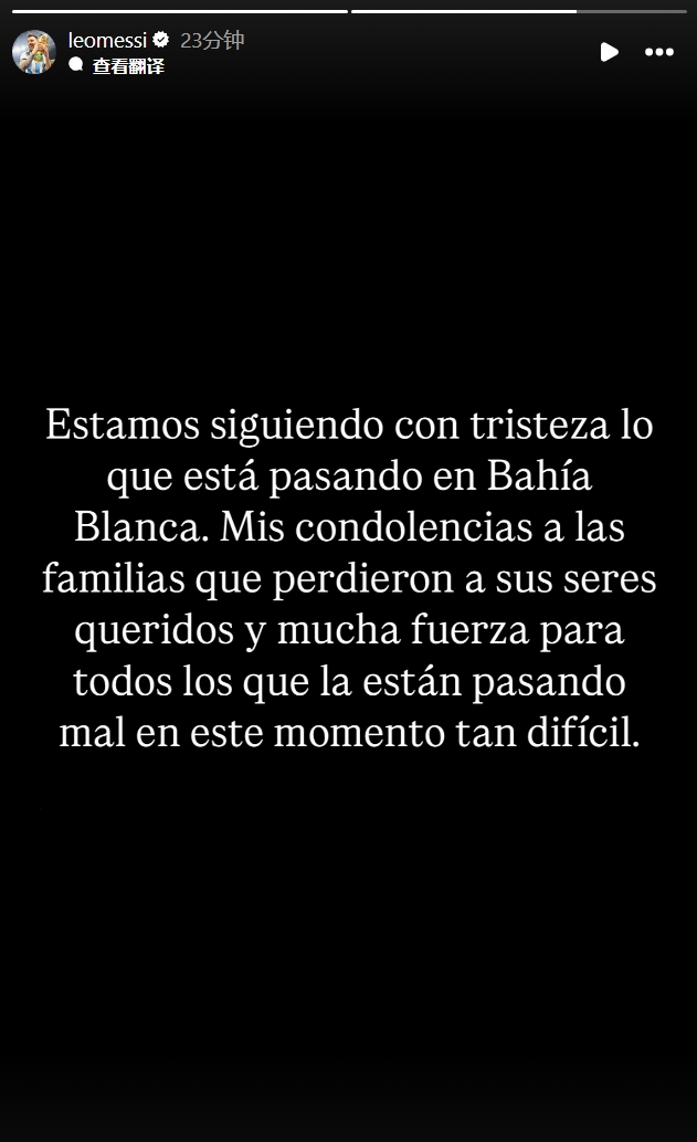 梅西寫道:“我們懷著悲痛的心情關(guān)注著bahía blanca正在發(fā)生的事情,我向那些失去親人的家庭致以哀悼,也希望所有在這個(gè)艱難時(shí)刻正經(jīng)歷困境的人能擁有力量。”