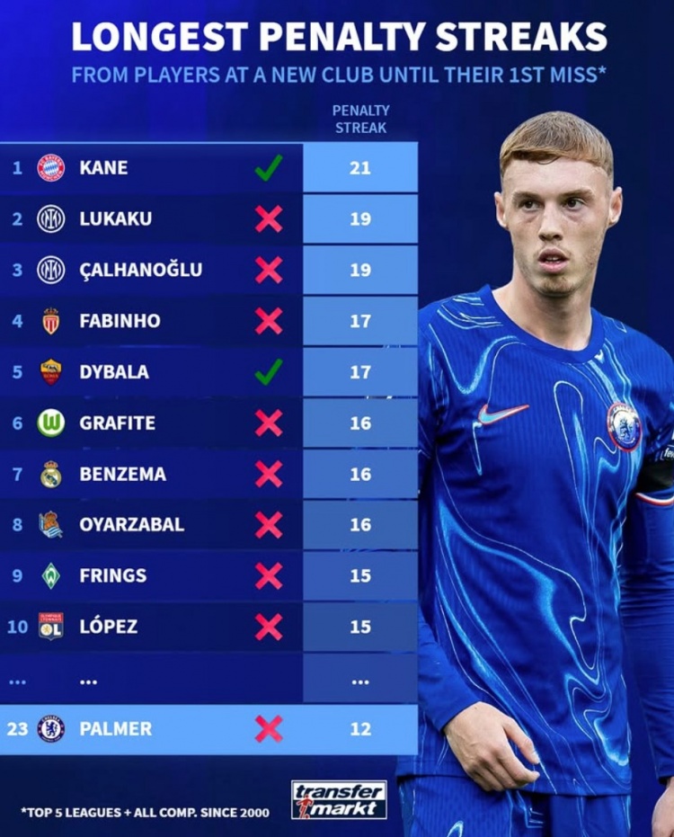 《轉(zhuǎn)會市場》統(tǒng)計了新世紀(jì)以來五大聯(lián)賽球員在新東家在不罰丟情況下連續(xù)命中點球紀(jì)錄,凱恩21球居首并且仍未罰丟。