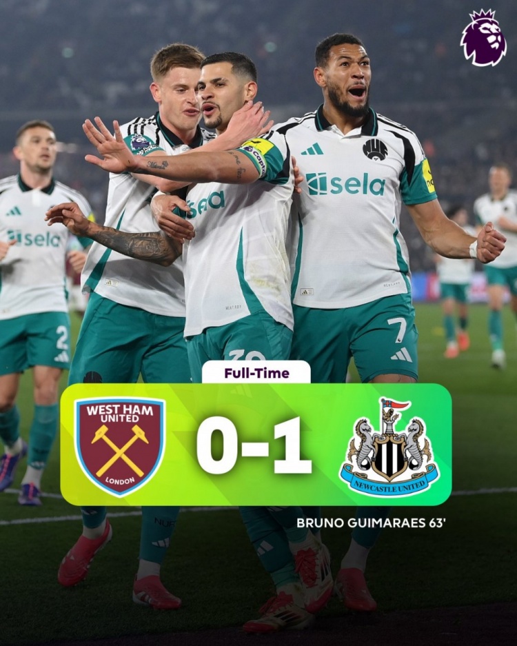 吉馬良斯制勝勝紐卡客場(chǎng)1-0擊敗西漢姆聯(lián),喜鵲積分已追平曼城