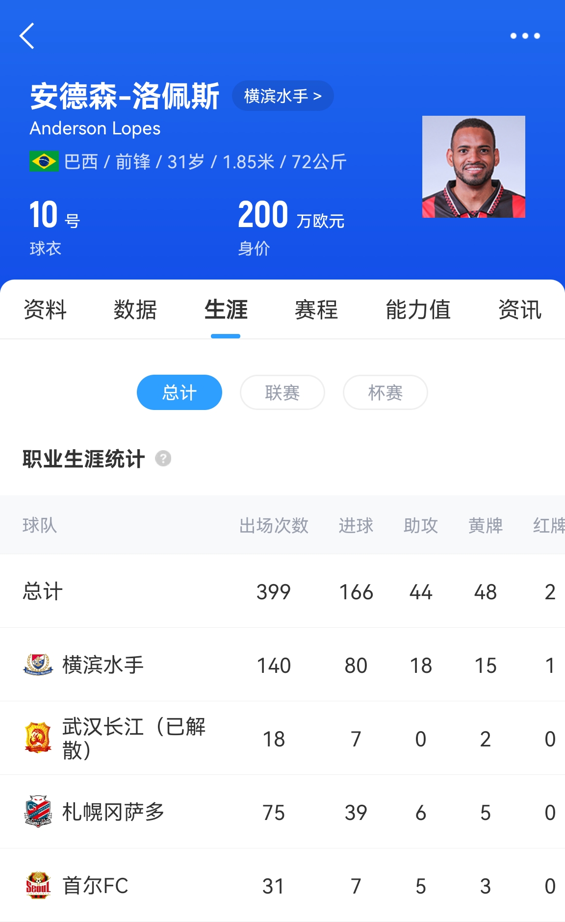 安德森-洛佩斯曾短暫效力中超聯(lián)賽,2021賽季,洛佩斯代表武漢隊(duì)出場(chǎng)18次打入7球。2022年2月,武漢隊(duì)官宣洛佩斯加盟橫濱水手,轉(zhuǎn)會(huì)費(fèi)180萬(wàn)美元。就在這次官宣不到一年后,武漢隊(duì)宣布解散。