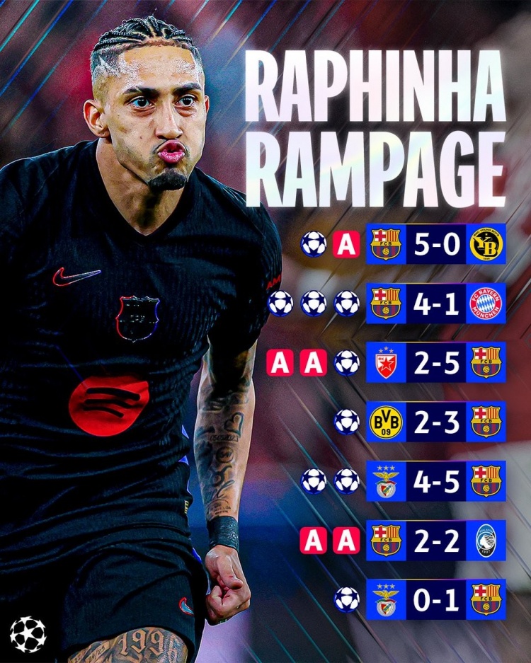 拉菲尼亞本賽季9場(chǎng)歐冠有7次參與進(jìn)球,共計(jì)9球5助攻&戰(zhàn)拜仁戴帽