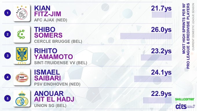 3月11日訊 數(shù)據(jù)分析機(jī)構(gòu)SkillCorner統(tǒng)計比甲和荷甲高速沖刺能力排行榜,阿賈克斯華裔中場天樂上榜。