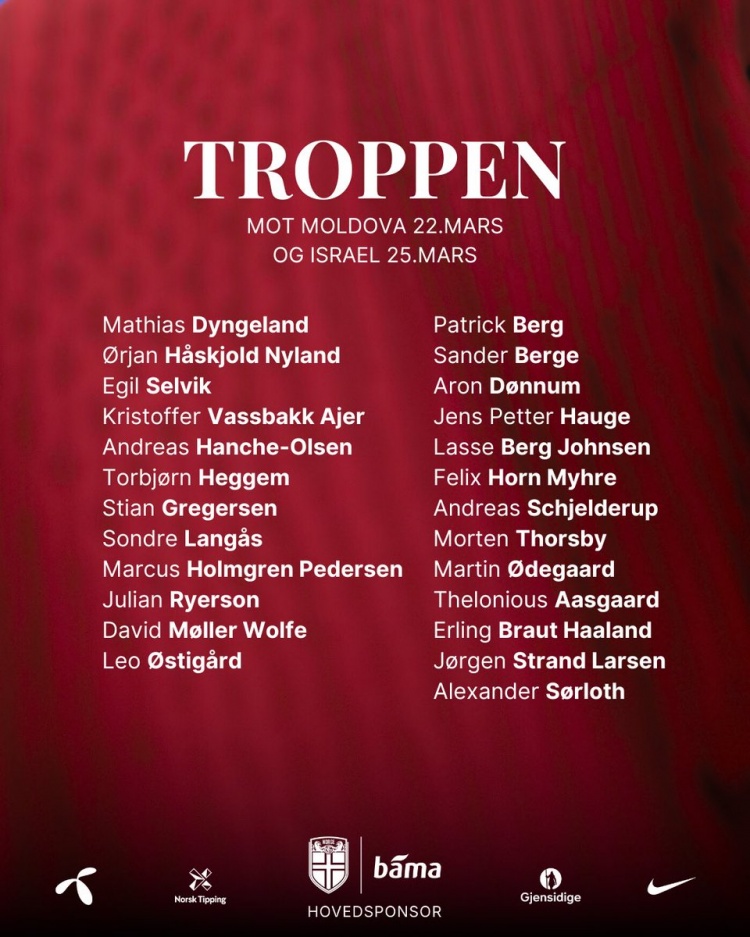 中前場:帕特里克-伯格(博德閃耀)、桑德-博格(富勒姆)、冬納姆(圖盧茲)、彼得-海于格(博德閃耀)、貝格-約翰森(馬爾默)、米赫埃(布蘭)、謝爾德魯普(本菲卡)、托斯比(熱那亞)、厄德高(阿森納)、阿斯高(盧頓)、哈蘭德(曼城)、拉爾森(狼隊(duì))、索爾洛特(馬競)
