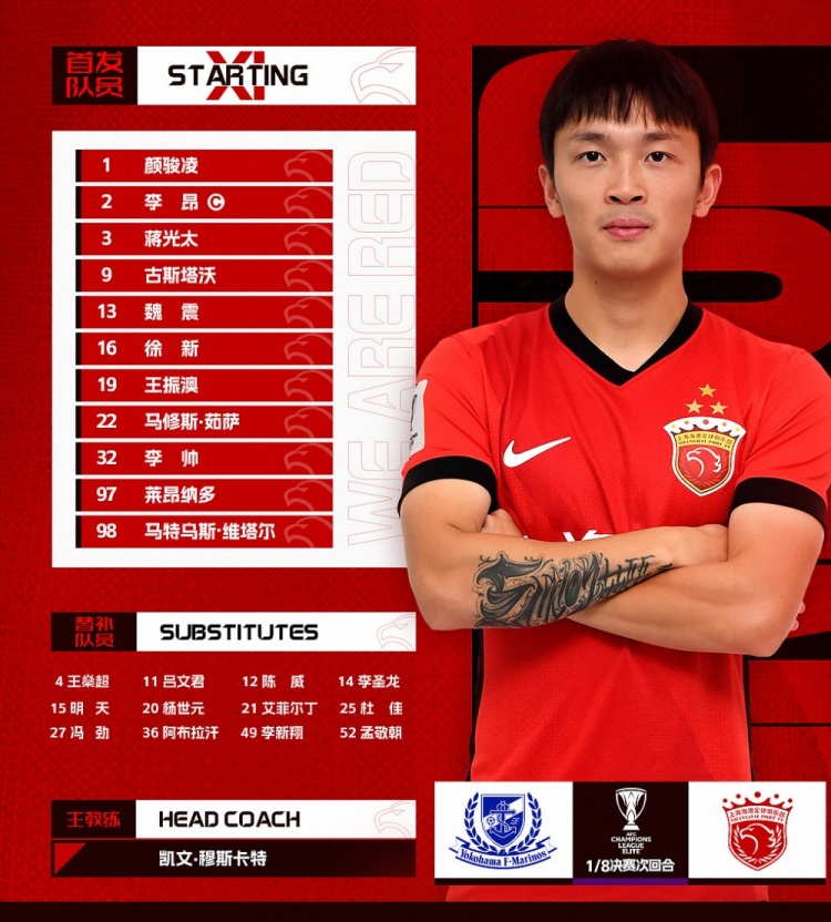 今日首發(fā)——亞冠精英聯(lián)賽1/8決賽次回合,橫濱水手vs上海海港