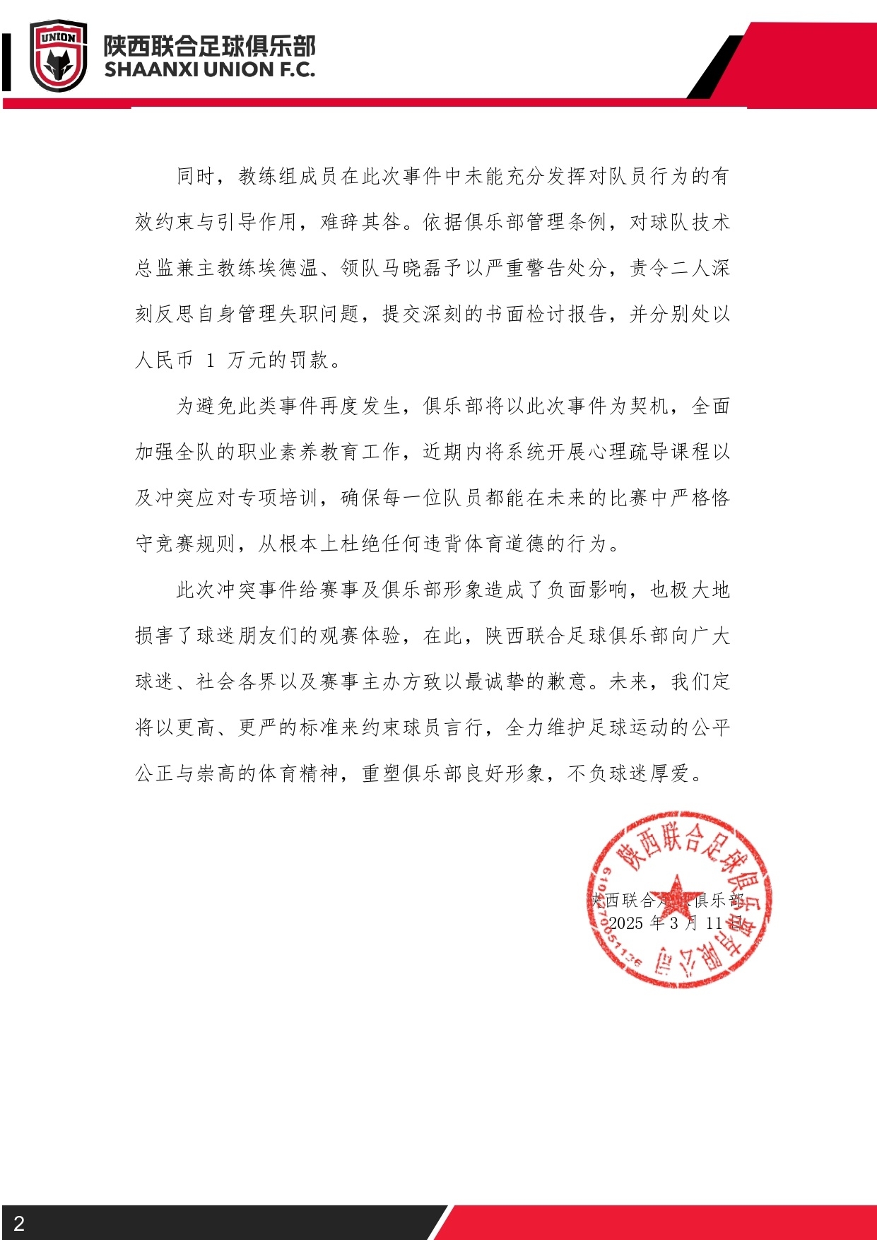 此次沖突事件給賽事及俱樂部形象造成了負(fù)面影響,也極大地?fù)p害了球迷朋友們的觀賽體驗,在此,陜西聯(lián)合足球俱樂部向廣大球迷、社會各界以及賽事主辦方致以最誠摯的歉意。未來,我們定將以更高、更嚴(yán)的標(biāo)準(zhǔn)來約束球員言行,全力維護(hù)足球運動的公平公正與崇高的體育精神,重塑俱樂部良好形象,不負(fù)球迷厚愛。