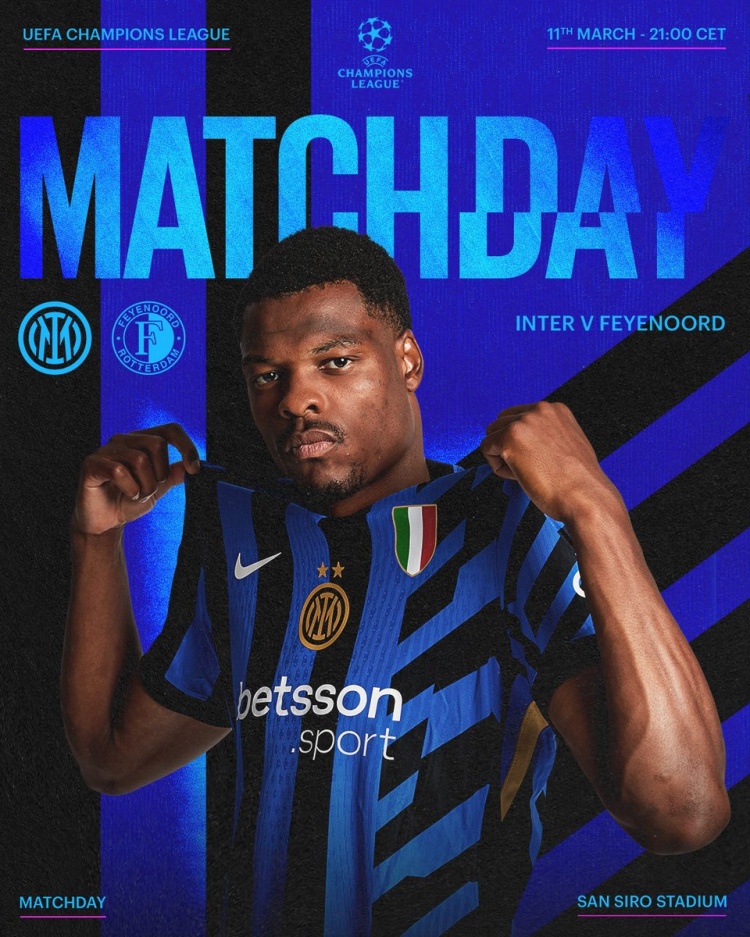 3月11日訊 北京時間明天凌晨4點,國米將在主場對陣費耶諾德,這是歐冠1/8決賽的次回合比賽,國米首回合2-0領先對手,國米在賽前發(fā)布了球隊海報。