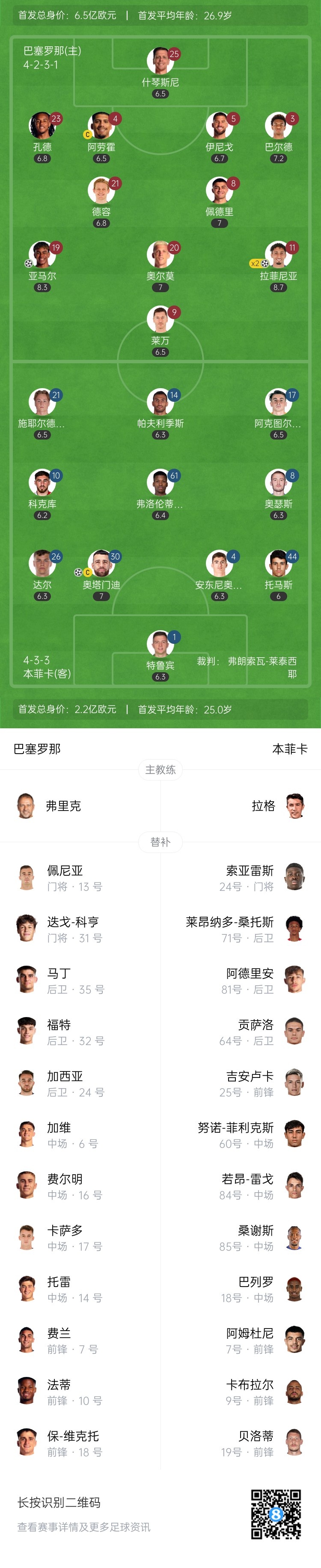 3月12日訊 北京時(shí)間1:45,歐冠1/8決賽次回合巴塞羅那主場(chǎng)迎戰(zhàn)本菲卡,首回合巴薩1-0占得先機(jī)。比賽在奧林匹克球場(chǎng)打響!上半場(chǎng),亞馬爾助攻拉菲尼亞破門;奧塔門迪很快扳平;隨后亞馬爾左腳禁區(qū)外兜射破門!巴爾德反擊助攻拉菲尼亞完成雙響!半場(chǎng)結(jié)束,巴薩暫3-1領(lǐng)先本菲卡,總比分4-1!