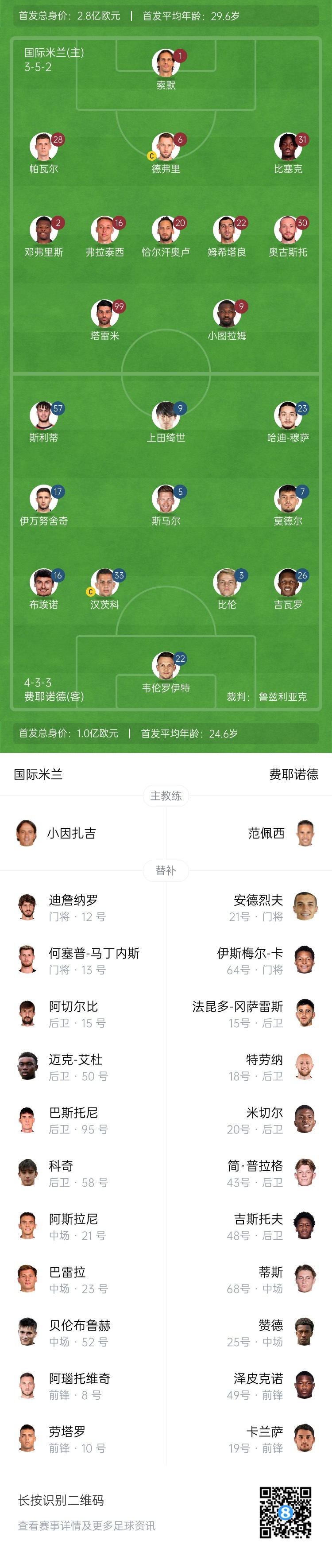 國米替補:12-迪詹納羅、13-J-馬丁內斯、8-阿瑙托維奇、10-勞塔羅、15-阿切爾比、21-阿斯拉尼、23-巴雷拉、50-艾杜、52-貝倫布魯赫、58-科基、95-巴斯托尼