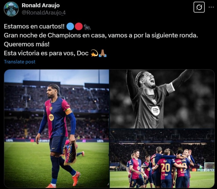 巴薩隊長阿勞霍也在賽后社媒曬照,將勝利獻給球隊已故隊醫(yī),配文寫道:“我們晉級8強,很棒的歐冠主場之夜,讓我們晉級下一輪!我們還想要更多。勝利獻給你,醫(yī)生?!?/p>