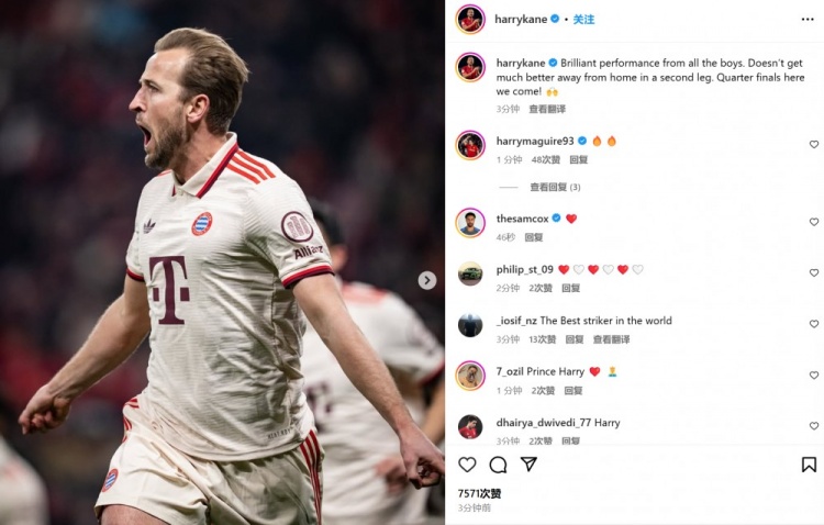 凱恩也在賽后通過社媒曬出自己的比賽照,并配文:“全隊(duì)交出精彩表現(xiàn),沒有比這更棒的客場次回合了。八強(qiáng)戰(zhàn)我們來了!”