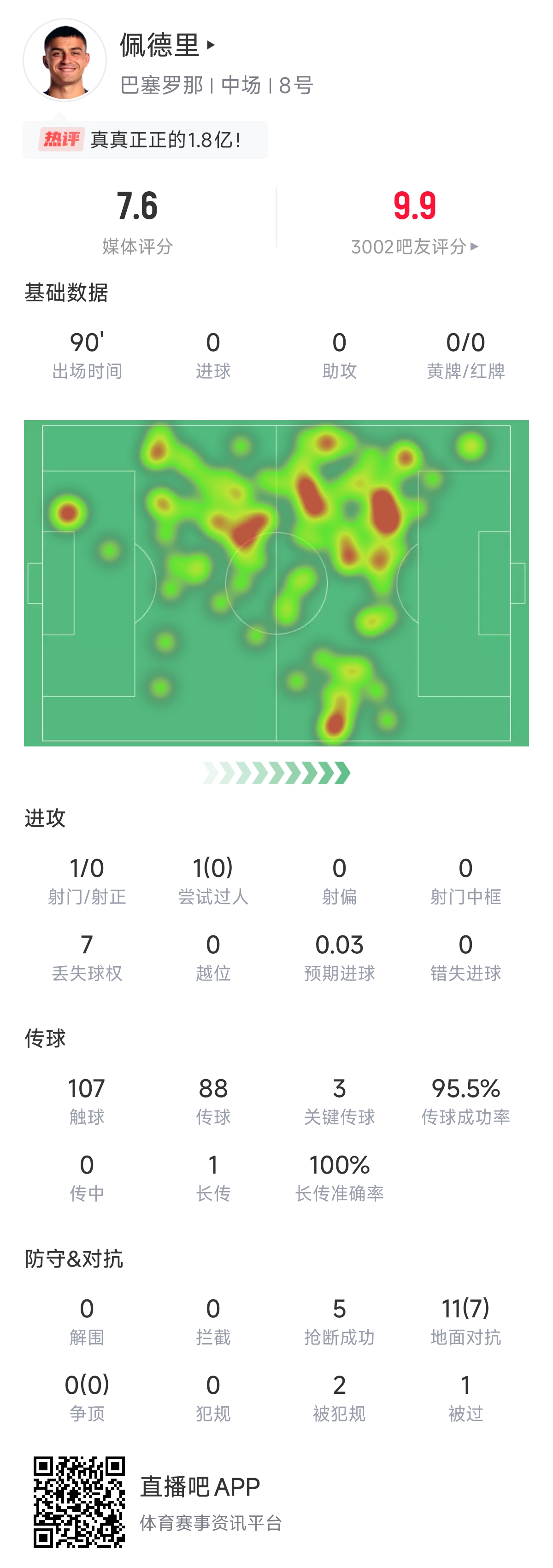 佩德里本賽季幾乎全勤,只缺席巴薩一場比賽,他在41場比賽里貢獻5球6助。不過進球數(shù)據(jù)并不能體現(xiàn)出佩德里的表現(xiàn)。例如他在本場比賽首發(fā)出戰(zhàn),貢獻3次關(guān)鍵傳球,觸球107次僅有7次丟失球權(quán),傳球成功率達到95.5%,另外他還有5次搶斷以及7次地面對抗成功。