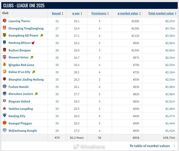 中甲聯(lián)賽各隊(duì)名單已在轉(zhuǎn)會(huì)市場(chǎng)更新。一線隊(duì)總身價(jià)最高的是遼寧鐵人,為525萬歐元,后面依次是重慶銅梁龍(376萬歐元)、廣東廣州豹(336萬歐元)、南通支云(296萬歐元)、蘇州東吳(280萬歐元)、陜西聯(lián)合(254萬歐元)、青島紅獅(235萬歐元)、大連鯤城(216萬歐元)、上海嘉定匯龍(205萬歐元)、佛山南獅(188萬歐元)、深圳青年人(186萬歐元)、定南贛聯(lián)(181萬歐元)、延邊龍鼎(168萬歐元)、南京城市(147萬歐元)、廣西平果(144萬歐元)、石家莊功夫(142萬歐元)。重慶銅梁龍是平均年齡最小的球隊(duì),為23.4歲;大連鯤城平均年齡最大,為28.1歲。