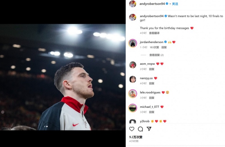 羅伯遜也在賽后通過社媒曬出自己的比賽照,并表示:“昨晚(的結(jié)果)并不在預(yù)期之內(nèi),還剩10場決賽!感謝大家送上的生日祝福!”