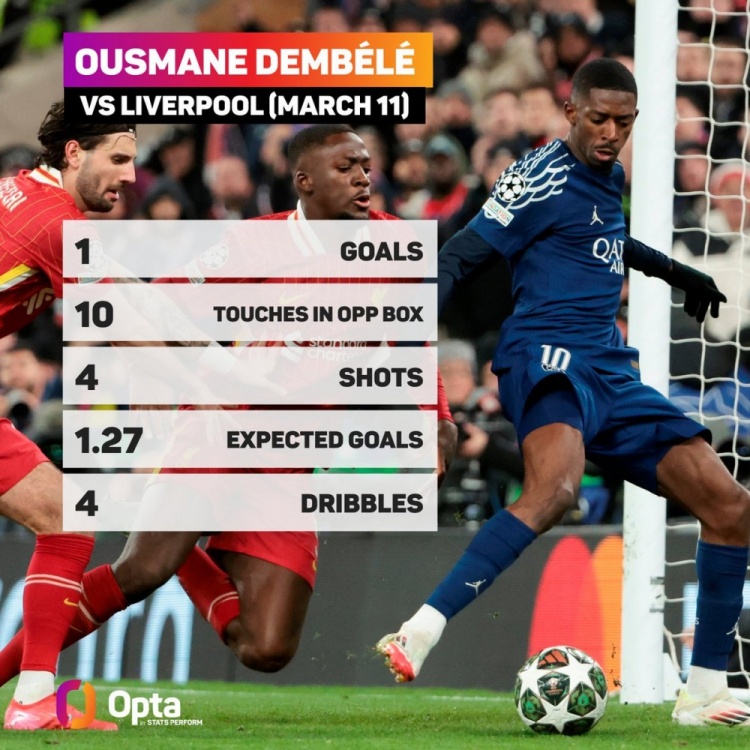 歐冠客戰(zhàn)利物浦在對(duì)方禁區(qū)觸球10次,登貝萊是有統(tǒng)計(jì)以來第二人