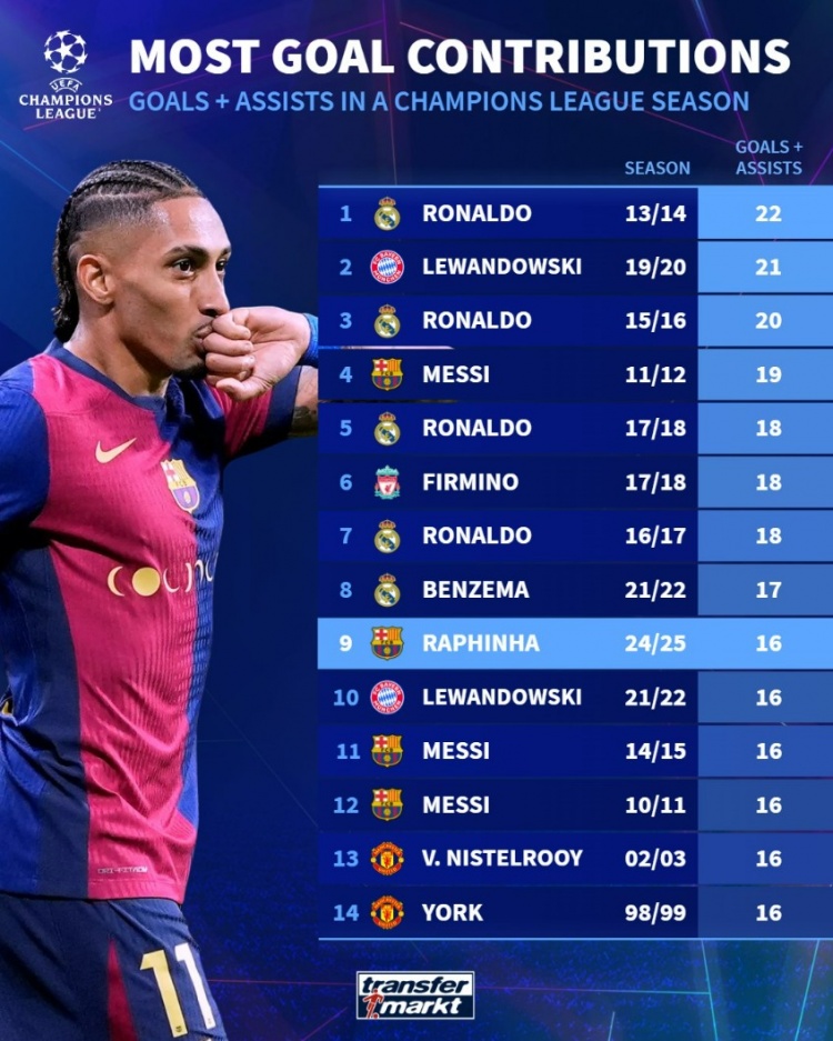 3月12日訊 本賽季拉菲尼亞在歐冠已經(jīng)有11球5助攻,直接參與16球。德轉(zhuǎn)也盤點了歐冠歷史單賽季參與進球榜,其中C羅22球居首,具體如下(進球+助攻):
