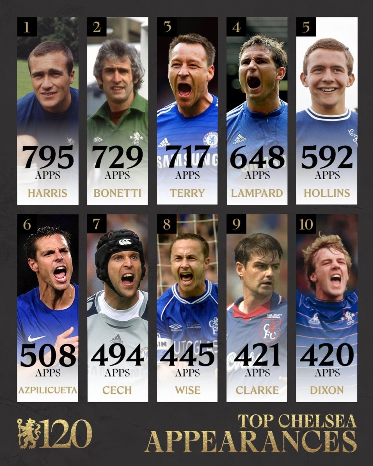 3月12日訊 切爾西俱樂部成立120周年,球隊(duì)官方社媒曬截至目前球員代表球隊(duì)出場(chǎng)次數(shù)榜,羅恩-哈里斯第一,特里第三,蘭帕德第四,AZP第六,切赫第七。