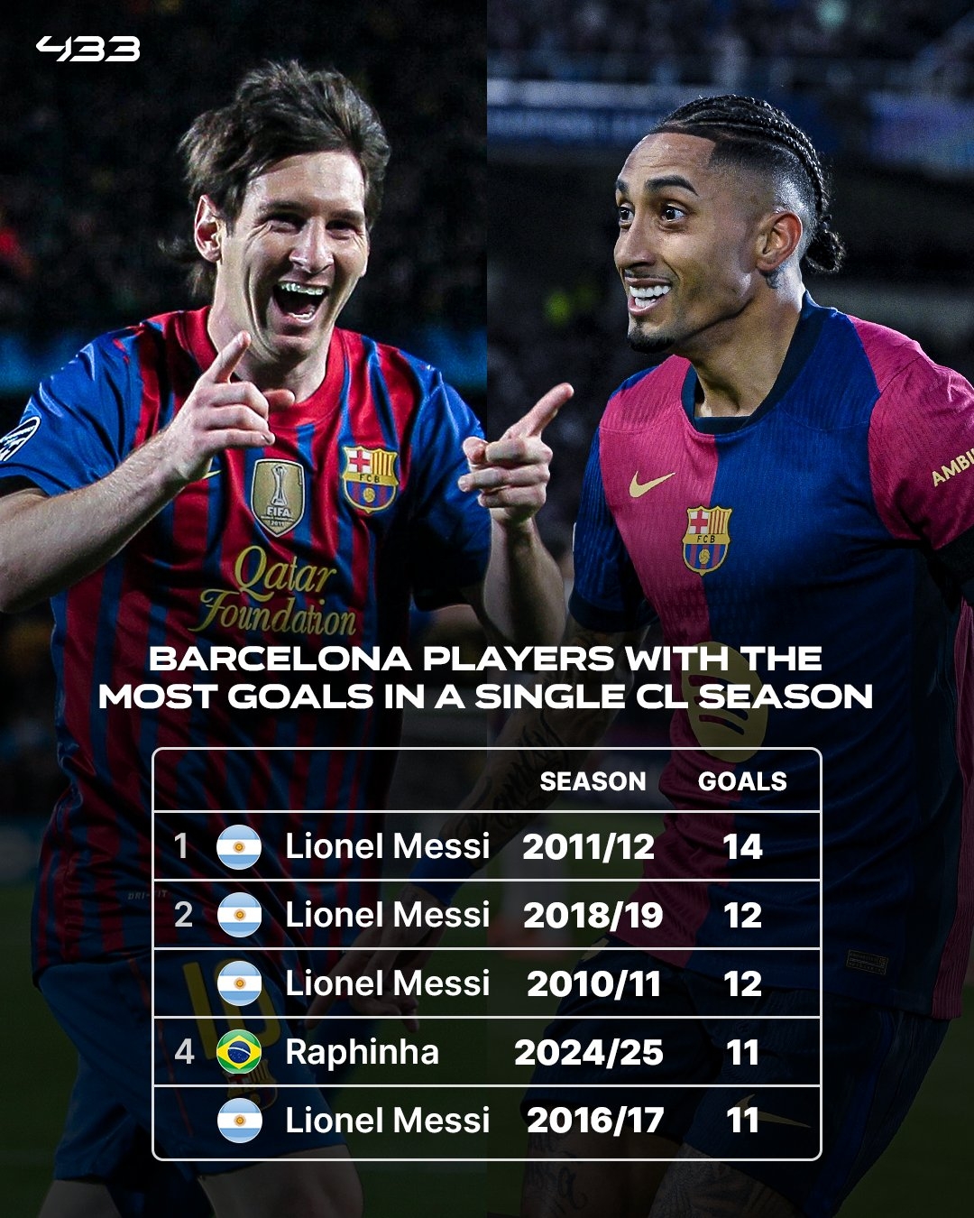 巴薩隊史個人單賽季進(jìn)球紀(jì)錄中,拉菲尼亞本賽季11球進(jìn)入前五,其余四席均是梅西。