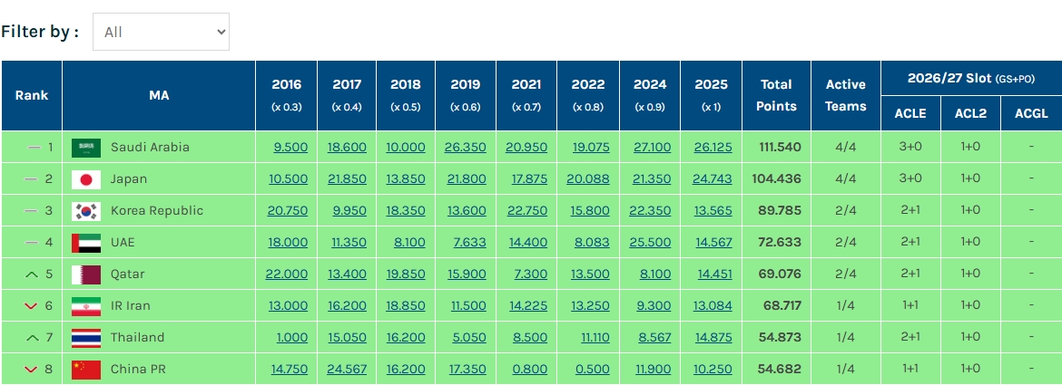 亞足聯(lián)俱樂(lè)部技術(shù)分東亞區(qū)第3,2+1個(gè)亞冠精英聯(lián)賽名額,1個(gè)亞冠2聯(lián)賽名額