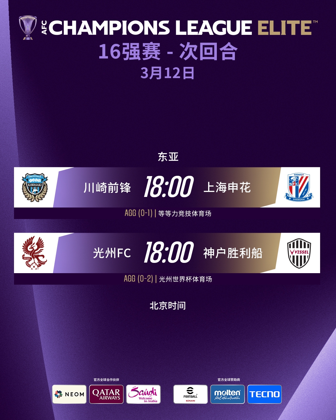 03月12日訊 亞冠精英聯(lián)賽1/8決賽將進(jìn)行最后兩場(chǎng)較量,上海申花客場(chǎng)挑戰(zhàn)川崎前鋒的比賽將決定中超聯(lián)賽的亞冠名額分配。