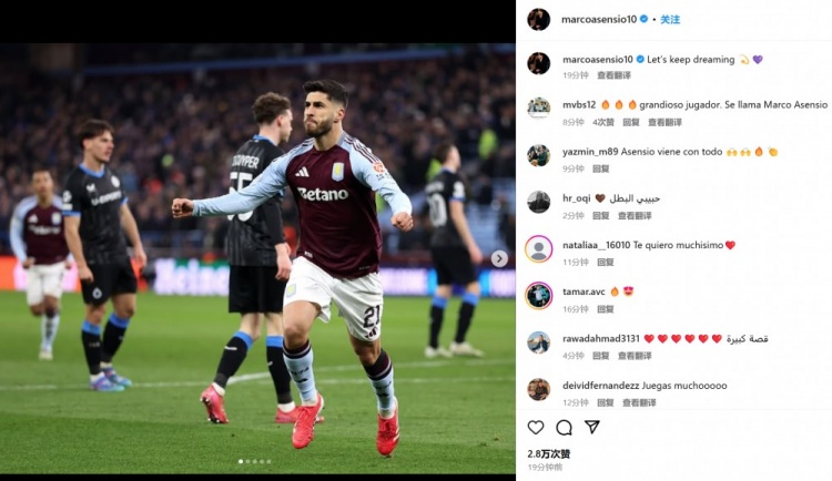 阿森西奧也在賽后曬出自己的慶祝照,并配文:“讓我們繼續(xù)保持夢(mèng)想????????”。