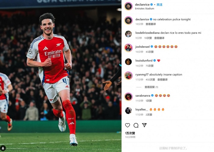 賴斯也在賽后通過社媒曬出自己進球后的慶祝照,并調(diào)侃:“今晚沒有慶祝動作的道德警察?!?/p>