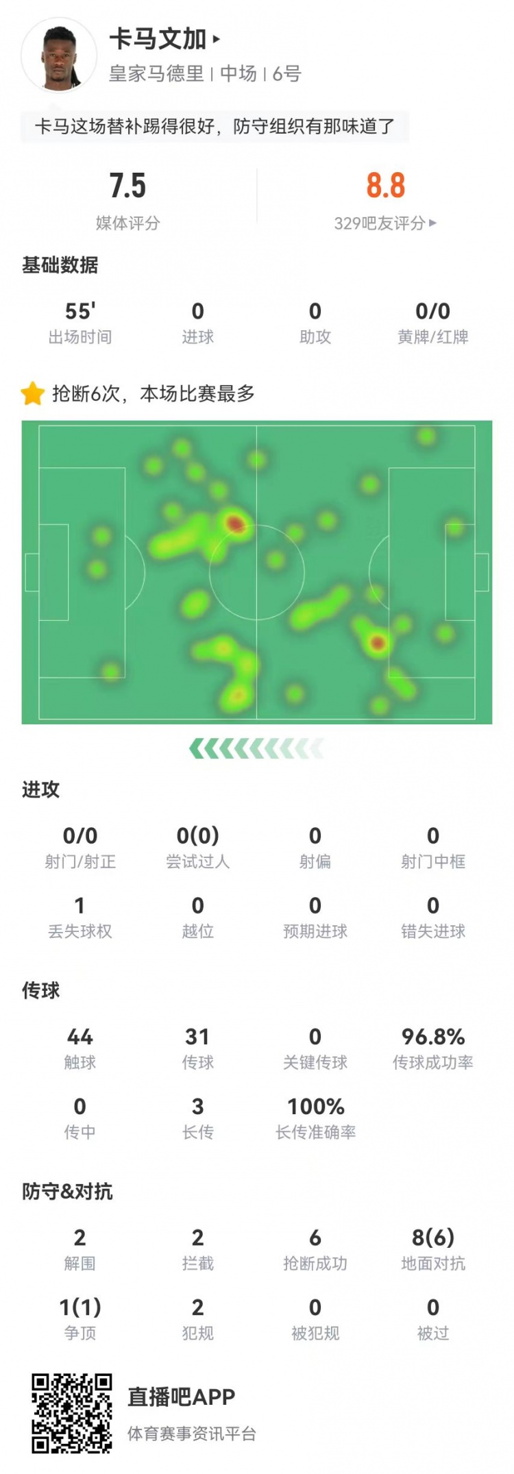 卡馬文加替補(bǔ)9對(duì)抗7成功+6搶斷2解圍2攔截 3長(zhǎng)傳3成功 獲7.5分