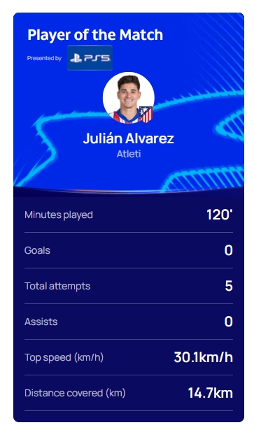 03月13日訊 歐冠1/8決賽次回合,皇家馬德里點球大戰(zhàn)戰(zhàn)勝馬競晉級8強,賽后,馬競前鋒阿爾瓦雷斯當(dāng)選了全場最佳。