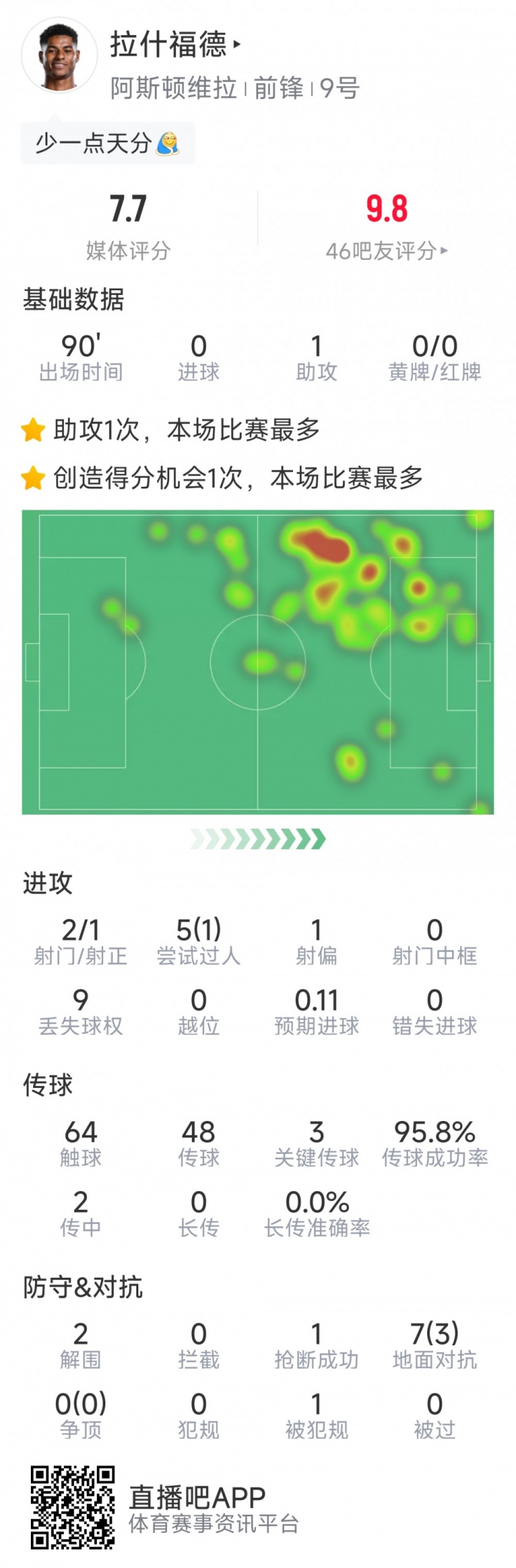 再送助攻,拉什福德本場數據:1助攻,3次關鍵傳球,2次射門