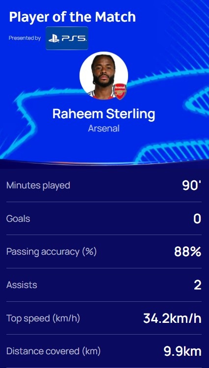 2送助攻,歐冠官方:斯特林當(dāng)選阿森納2-2埃因霍溫全場最佳