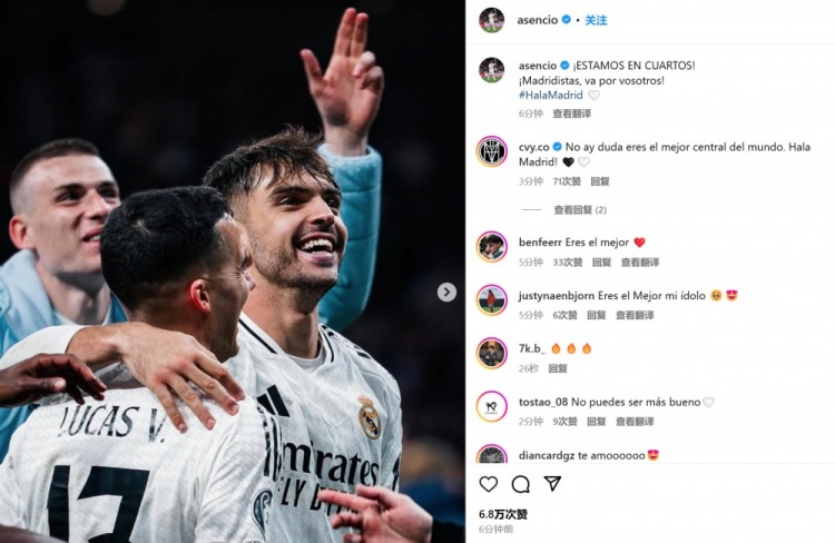 他也在賽后通過社媒曬出晉級后的慶祝照,并喊話球迷:“我們晉級歐冠八強了!馬德里主義者們,這是獻給你們的!”