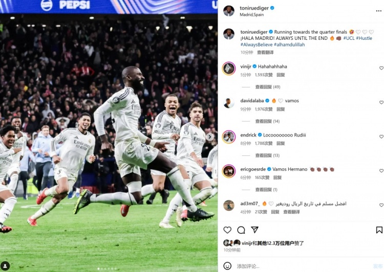 本場(chǎng)比賽呂迪格打進(jìn)致勝點(diǎn)球,賽后他也在個(gè)人社媒曬出全隊(duì)瘋狂慶祝照,配文寫道:“沖向歐冠8強(qiáng),Hala Madrid,永遠(yuǎn)堅(jiān)持到最后一刻!”
