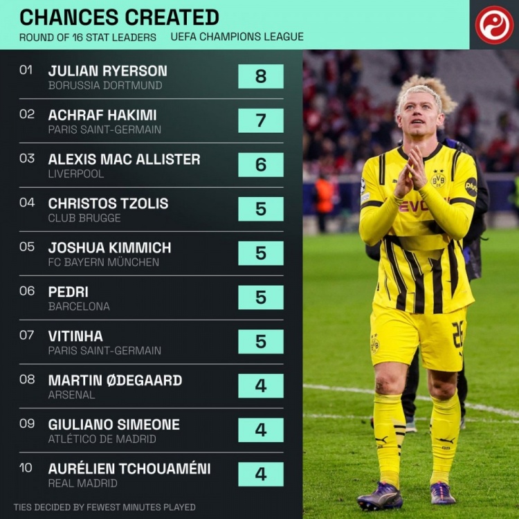 3月13日訊 歐冠16強戰(zhàn)已經(jīng)完賽,squakwa也統(tǒng)計了本輪兩回合的創(chuàng)造機會情況,多特邊后衛(wèi)萊爾森最多。