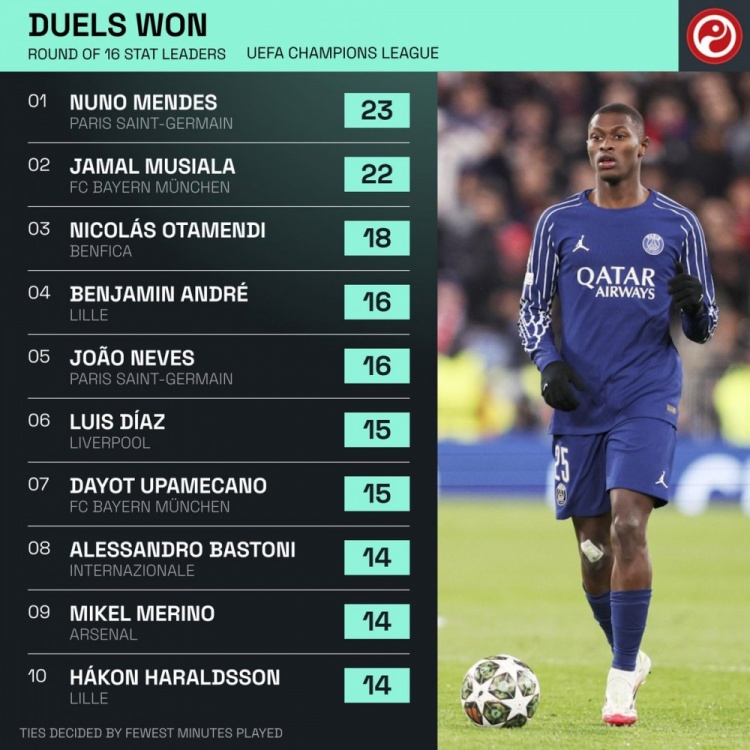 3月13日訊 歐冠16強(qiáng)戰(zhàn)已經(jīng)塵埃落定,squakwa也統(tǒng)計(jì)了本輪的成功對抗情況,努諾-門德斯力壓穆西亞拉居首。