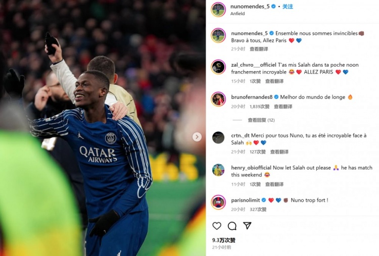 同薩拉赫對(duì)位的巴黎邊后衛(wèi)努諾-門(mén)德斯堪稱(chēng)晉級(jí)的隱形功臣,他也在賽后通過(guò)社媒曬照慶祝:“團(tuán)結(jié)起來(lái)的我們是無(wú)敵的!大家做得很棒,巴黎加油!”